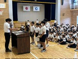 集会では、7月22日(月)に行われた水泳記録会の表彰を行いました。入賞した皆さんおめでとうございます。選手の皆さん、本当によく頑張りました。